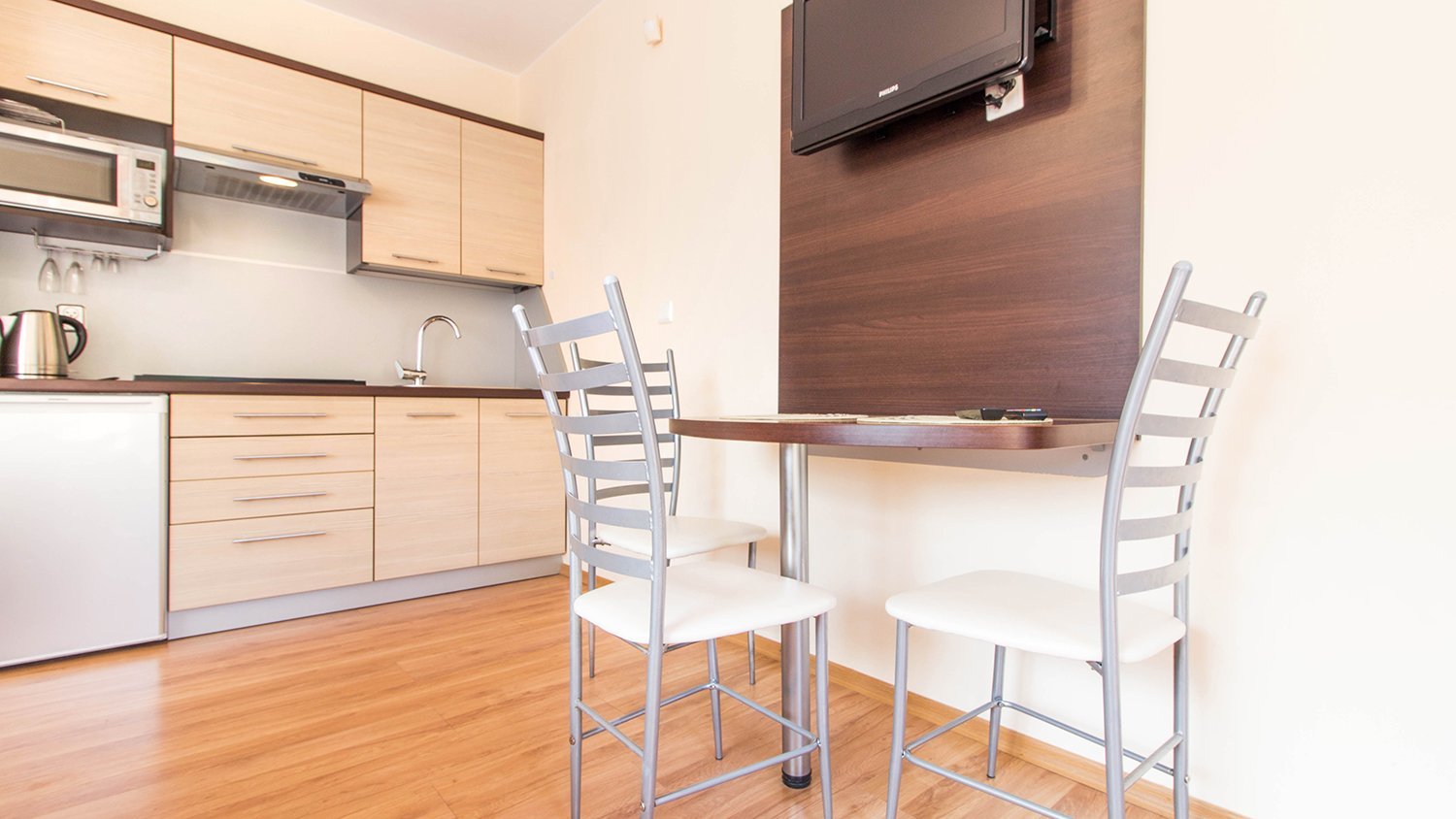 - kuchnia (w pełni wyposażona - kuchenka elektryczna, lodówka, mikrofalówka, czajnik, kieliszki do wina)